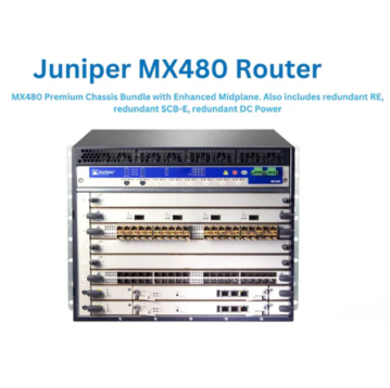 The Juniper MX480 is a robust and powerful routing platform. It comes with a premium chassis bundle featuring an enhanced midplane, redundant Routing Engines (RE), redundant Switch Control Boards (SCB-E), and redundant DC power supplies. This router is perfect for enterprise networks requiring high performance and reliability, ensuring continuous service availability for mission-critical operations.